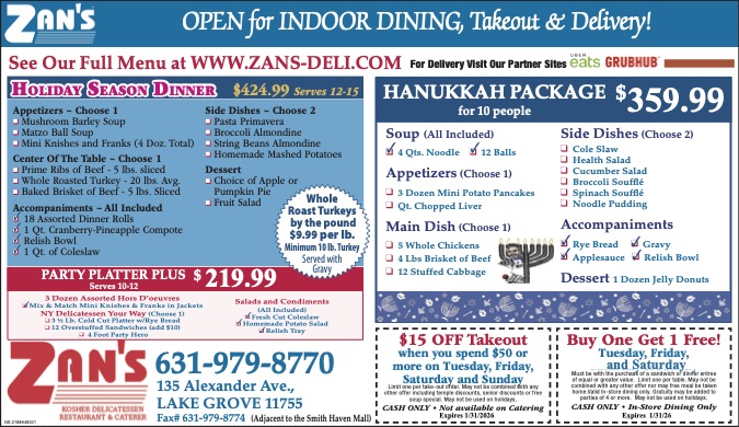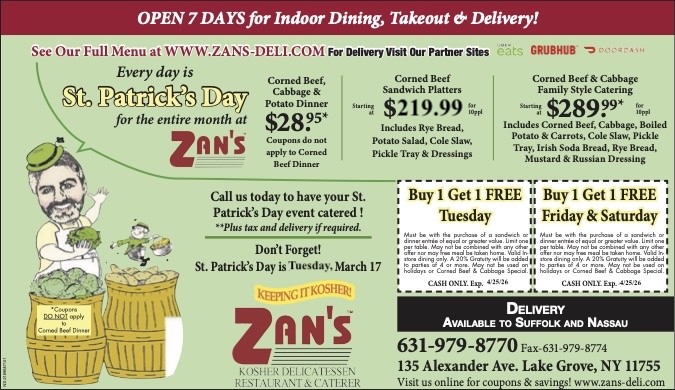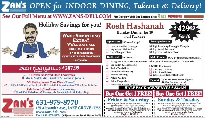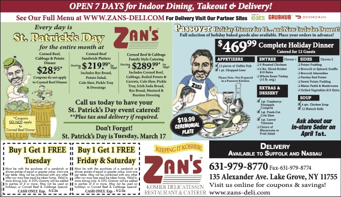 Zan’s Kosher Delicatessen is Long Island’s largest Kosher restaurant and caterer serving the New York metro area for 40 years. Zan’s is famous for its homemade soups, Delicious Pastrami, and corned beef sandwiches, even Zan’s French Fries are made from scratch. From Bris to Bar Mitzvah, weddings to private parties, condolence, and corporate catering, Zan’s Kosher Deli provides a feast for both the mouth and eyes. Zan’s has been the number one choice for Holiday meals & corporate catering, Thanksgiving, Passover, Rosh Hashanah, and Yom Kippur.
